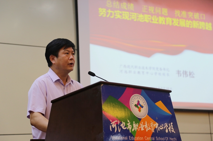 会上,学院院长黄绍光代表学院作专题发言,介绍了我院的办学情况、办学特色及办学成果。学院党委书记、市职业教育中心学校校长韦伟松作了题为《总结成绩正视问题 找准突破口 努力实现河池职业教育发展的新跨越》的集团化办学讲话。他指出,近年来,河池职业教育在整体提升上整合成功,突围发展,规模不断扩大;在学校管理、专业提升、队伍建设、校企合作等内涵建设方面成绩显著;主动融入,着力提升为地方社会经济服务能力。推进职业教育集团化办学,要统一思想,具有强烈的忧患意识,要有发展才是硬道理、抱团发展才是硬道理、齐心才是硬道理的信念,找准突破口,做大做强职教教育。