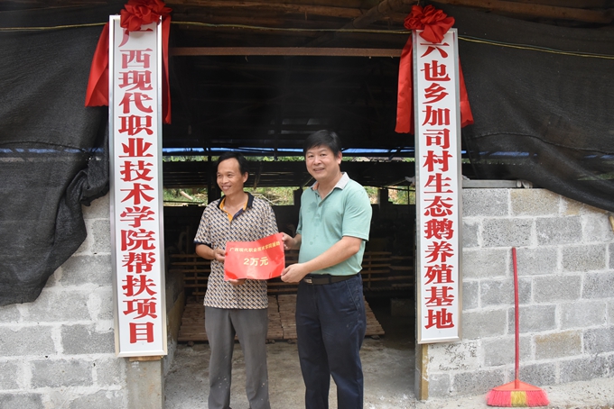 学院领导走访慰问了加司村和华善村的贫困户、老党员,与他们亲切攀谈,详细了解生活情况,并为他们送去慰问金和慰问品。学院党委书记韦伟松、学院院长黄绍光与六也乡领导共同为广西现代职业技术学院农民工培训基地、六也乡加司村生态鹅养殖基地揭牌,并向加司村、华善村两委赠送电脑、打印机、电脑桌等办公用品。