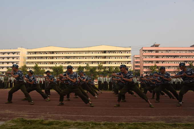 分列式汇演结束后,男子拳术方队、女子匕首操方队等还分别进行了汇报表演《男子擒敌拳》、《女子匕首操》和《感恩的心》手语操,教官们也带来了精彩的表演,场上不时爆发出一阵阵热烈的掌声。