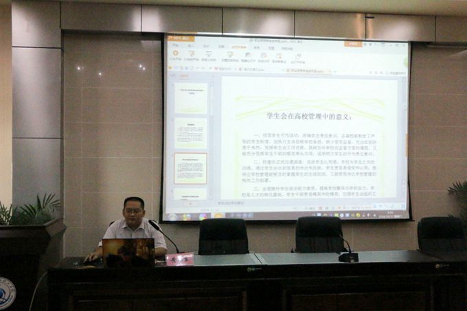 河池市清正社会工作服务中心主任黄福东为学生候选干部开展培训讲座,针对学生干部的活动组织策划能力、社交礼仪、心理健康方面进行讲解。他还表示,大学生是国家将来的栋梁之才,服务中心会竭尽所能,将社会工作理念与方法运用到学校学生工作中,助力学校师生的共同发展和进步。