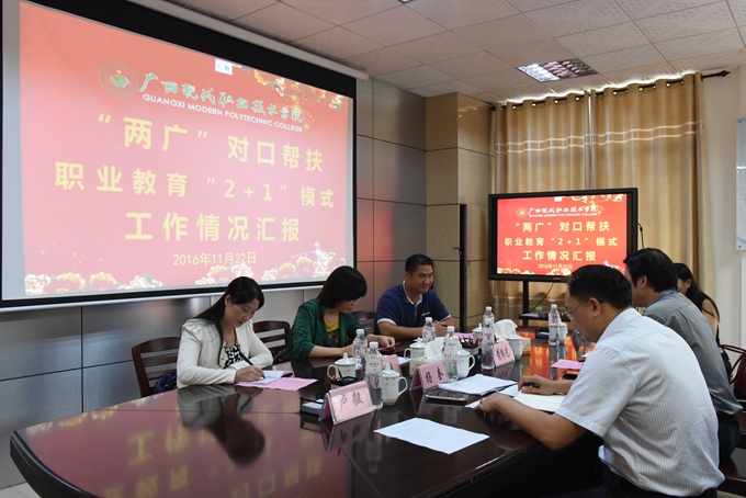 11月22日下午,自治区扶贫办专家组一行4人莅临我院检查指导工作,对我院及市职业教育中心学校的“两广”对口帮扶职业教育协作试点“2+1”模式、2015年顶岗实习工作进行验收。学院院长黄绍光出席汇报会,我院及市职业教育中心学校职能部门负责人参加汇报会。