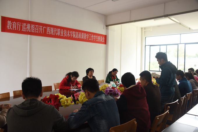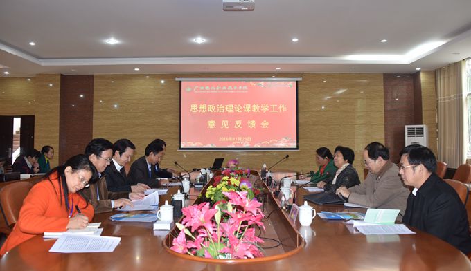 在汇报会上,巡视组组长陈雪斌强调了此次高校思想政治理论课教学巡视工作的目的和意义。院长黄绍光介绍了我院的办学情况、办学特色、办学成果以及发展情况等。副院长韦胜东详细汇报了我院思想政治理论课教育教学的主要经验、教师队伍建设、课程建设、教学改革、科研建设和主要特色。