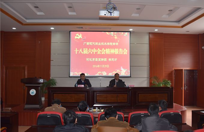 11月29日,市政协文教卫体委主任、市委宣讲团成员韦茂才到我院宣讲十八届六中全会精神。学院党委书记韦伟松、学院党委副书记、副院长霍江华、副院长韦胜东、纪委书记冉景峰、副院长冯忠伟出席报告会。全体教职工到场聆听宣讲报告。报告会由学院党委副书记、副院长霍江华主持。