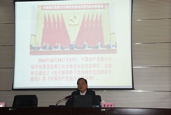韦茂才从十八届六中全会的意义、十八届六中全会的重大亮点、新形势下加强和规范党内的关键问题、强化党内监督以及如何为全面从严治党作贡献进行专题讲解。宣讲内容丰富全面、论述精辟,对全体教职工全面、准确、深入地领会全会精神具有指导意义。