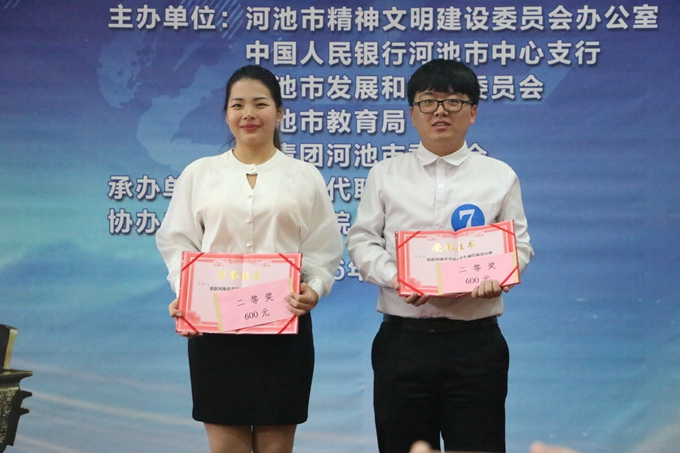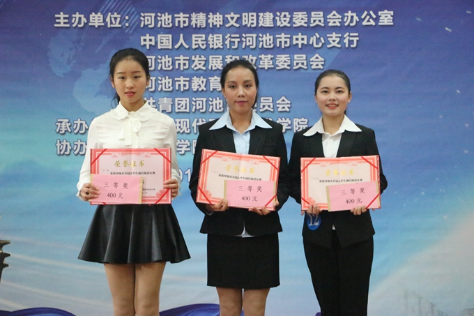 揭牌仪式结束后,来自河池学院及我院的12名选手进行诚信演讲比赛。参赛的同学引用经典及时事热点等,结合校园生活实际谈自己对诚信的理解。经过激烈的角逐,我院教育系韦佳同学以9.89的成绩获得冠军,庞乾玉、崔宇洋获得二等奖,徐婷、王彩凤、吴岷桦获得三等奖。