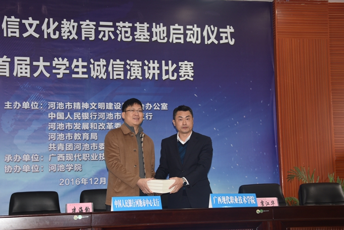 启动仪式上,人民银行河池市中心支行行长冼海钧、学院党委副书记、副院长霍江华分别作了讲话。霍江华表示,我院将把诚信教育作为学生德育工作的重要内容,作为一项长期的重点工程来抓,积极探索学生诚信素养提升的途径、形式、方法和评价体系,构建学生诚信教育的操作框架,积极发挥高校的文化引领作用。我院将配合河池市诚信办深入推进诚信示范基地建设,明确职责,专人负责,制定工作目标和工作实施方案,不断深化青年学生养成教育及诚信教育,培育师生的信用意识和信用习惯,进一步落实诚信举措,突出诚信效果,争做“诚信河池”的倡导者、传播者、践行者和建设者,共同推进优良校风和良好社会信用环境的形成。