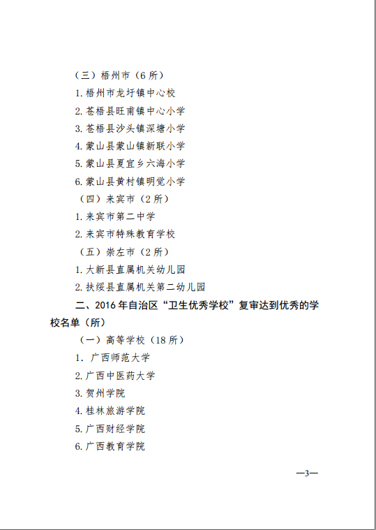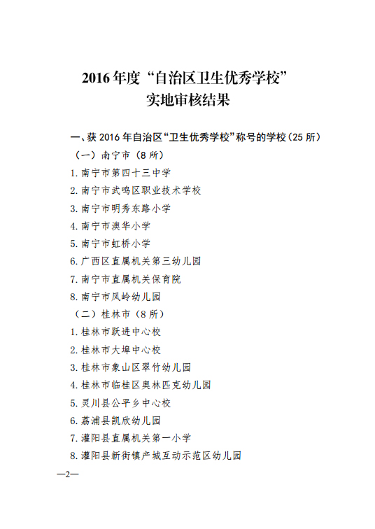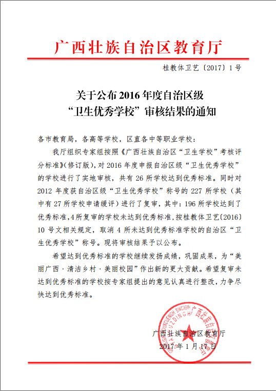 近日,自治区教育厅发文公布了2016年度自治区级“卫生优秀学校”审核结果(桂教体卫艺〔2017〕1号),我院通过了自治区级“卫生优秀学校”复审达标评估,获得2016年自治区级“卫生优秀学校”称号。