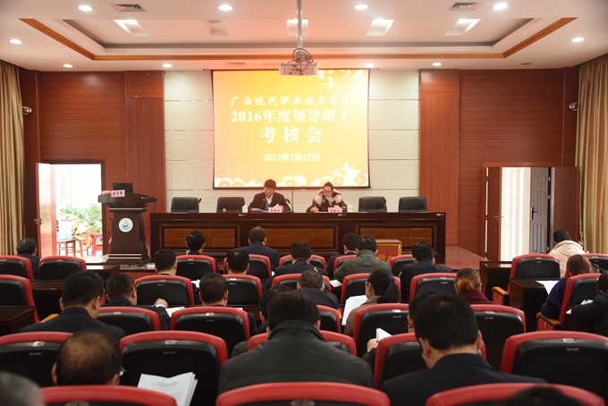 2月27日,我院在第二学术报告厅召开2016年度领导班子考核会,学院党委书记韦伟松、院长黄绍光、党委副书记、副院长霍江华、副院长韦胜东、副院长冯忠伟、学院工会主席覃志航以及学院全体中层参加了此次会议。会议由学院党委书记韦伟松主持,河池市委组织部覃艳阳到会指导。