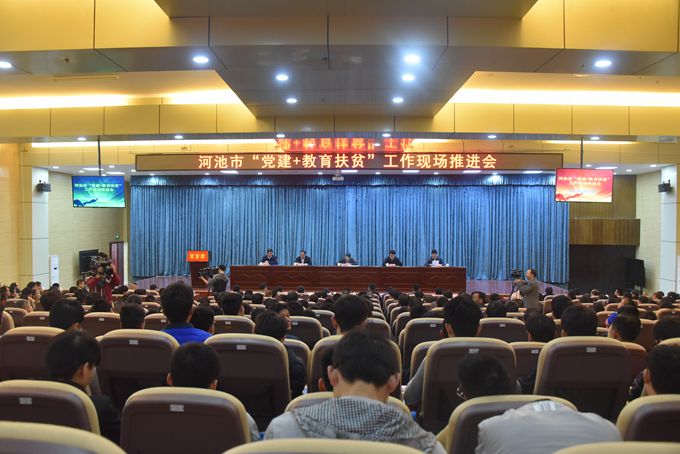 为全面深入推行“党建+”工作模式,交流工作经验,研究部署下一阶段“党建+教育扶贫”工作,3月27日,河池市“党建+教育扶贫”工作现场推进会在河池市职业教育中心学校厚德厅召开。市委常委、组织部部长马南萍,市委组织部副部长卢嘉进,金城江区区委书记覃生贤,学院党委书记、市职业教育中心学校校长韦伟松,院长黄绍光,市脱贫攻坚指挥部、市委组织部、市扶贫办、市人社局、市农业局、市财政局、市教育局、市商务局等市直单位领导以及各县(市、区)党委常委、组织部长出席会议。各县(市、区)扶贫办主任、金城江区各乡镇、街道党工委书记、我院和市职业教育中心学校部分教师以及参加学员招聘会的企业方代表等参加会议。会议由市委组织部副部长卢嘉进主持。