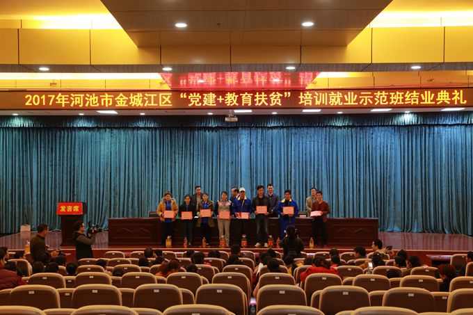 又讯 3月27日上午,河池市金城江区“党建+教育扶贫”培训就业示范班结业典礼在市职业教育中心学校厚德厅举行。学院党委副书记、副院长霍江华,市职业教育中心学校副校长唐启焕等领导出席会议。金城江区“党建+教育扶贫”培训就业示范班全体学员参加会议。结业典礼由市职业教育中心学校副校长唐启焕主持。