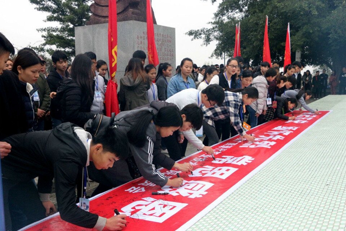 当天下午,我院300多名学生代表带着花圈步行至金城江公园,国旗班代表向韦拔群烈士纪念碑敬献花篮,在庄严的国歌中,全体师生面向烈士纪念碑默哀一分钟。随后,全体师生面向烈士纪念碑宣誓,并进行“缅怀革命先烈、感恩幸福生活”横幅签名仪式。
