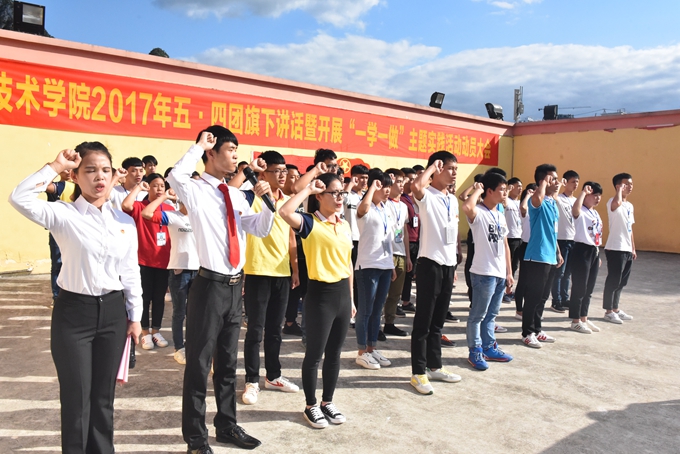 为壮大我院共青团员队伍,加强广大青年团员的思想政治教育,树立爱国爱党爱人民崇高的远大理想,5月4日下午,学院团委在学院田径场舞台举行2017年广西现代职业技术学院五·四团旗下的讲话暨开展“一学一做”主题实践活动动员大会。各系500名新老团员参加仪式。
