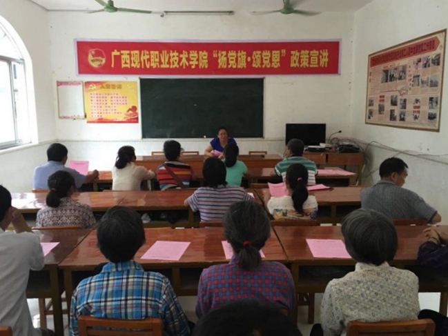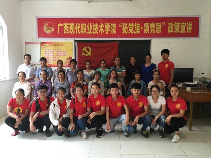 7月10日上午,我院暑期“三下乡”社会实践“扬党旗·颂党恩”政策宣讲小分队在院团委副书记李秀华和社科部覃秋燕老师的带领下,前往我院对接扶贫点大化六也加司村及华善村,开展了为期3天的社会实践活动。下午,社会实践队到达活动地点大化六也加司村,第一书记黄菁老师带领实践队员慰问贫困家庭,向他们赠送了粮油和大米等生活物资,还将文具用品送到留守儿童手中。