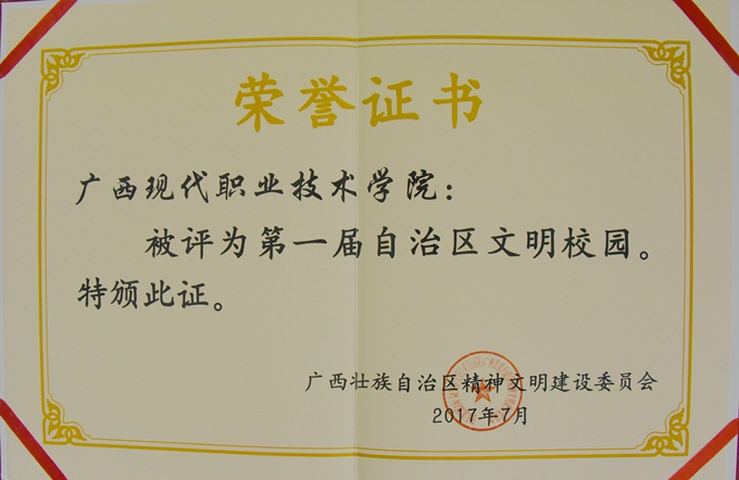 文明校园建设,是学校可持续发展的基础和办学水准的标尺。我院将以强烈的进取心和旺盛的创造力,进一步提升办学水平,全面推进素质教育,努力凸现办学特色,办好人民满意的职业教育。我们坚信,在各级领导的亲切关怀和大力支持下,广西现代职业技术学院的明天将更加辉煌,更加美好!