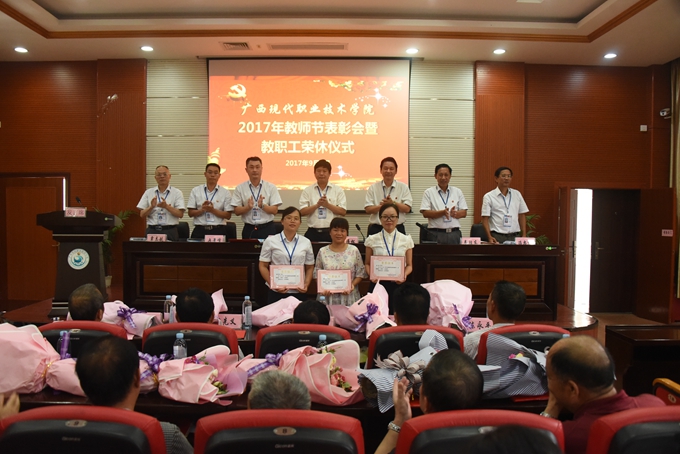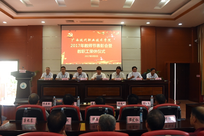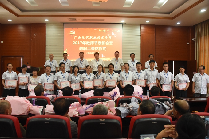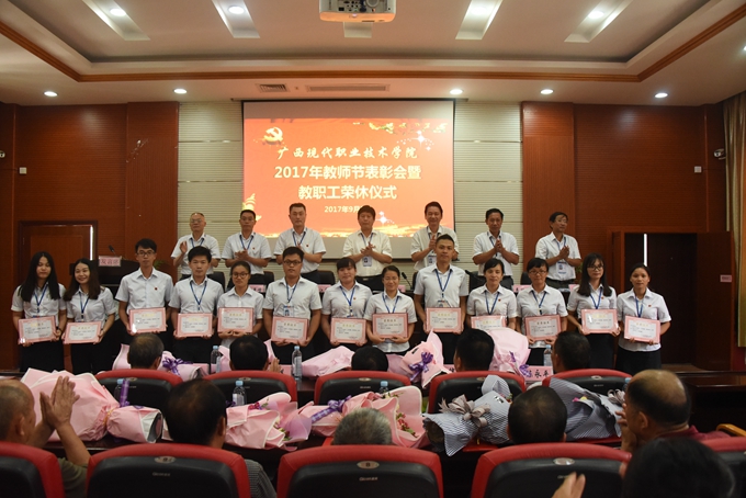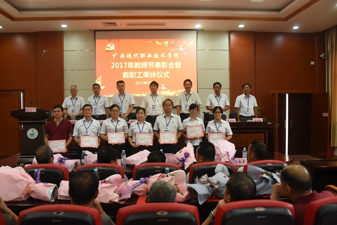 为庆祝第33个教师节,9月8日下午,我院在第二学术报告厅召开2017年教师节表彰大会暨教职工荣休仪式,对过去一年先进集体、优秀教师、优秀教育工作者、优秀班主任(或辅导员)、学生技能竞赛优秀指导教师、培训工作先进个人、项目建设突出贡献奖和教学标兵等进行表彰授奖,为光荣退休的教职工送上祝福。学院党委书记韦伟松、院长黄绍光,党委副书记、副院长霍江华,副院长韦胜东、纪委书记冉景峰、副院长冯忠伟、工会主席覃志航出席会议。全体教职工参加会议。会议由学院党委副书记、副院长霍江华主持。