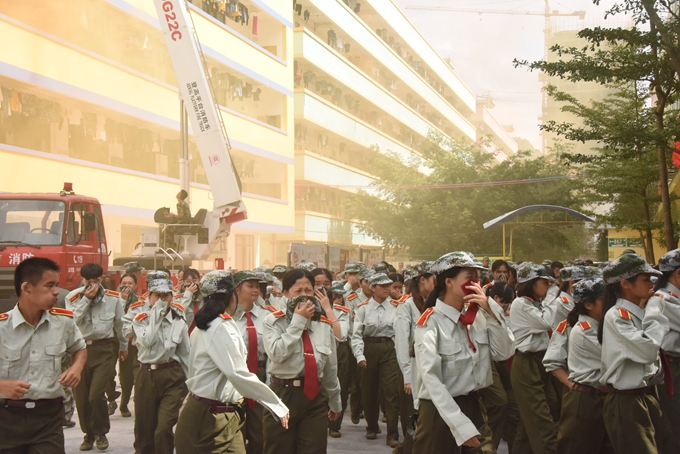 在活动中,金城江消防大队、中队官兵为2017级学生讲解了火场逃生知识、灭火器的使用、快速穿戴消防服、消防安全常识,消防官兵做示范、引导学生进行现场操作;还为学生进行了火灾地震逃生自救相关知识的培训。消防官兵随后组织学生进行模拟火场疏散逃生演练,随着消防车警报声响起,学生在消防官兵的指导保护下,按规定工作有序从宿舍跑到安全地带集合。