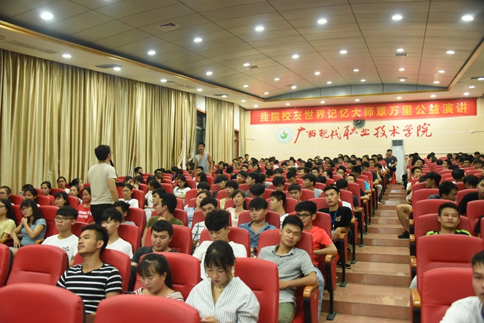 覃万里老师还从自身经历为校友们讲述了他如何从一个大山里的孩子,通过刻苦学习、不懈努力走出大山,成长为今日的世界记忆大师。他希望通过传授超级记忆法,让更多的家乡人在学习和工作中受益,并影响更多的身边人运用正确的记忆方法,提高学习和工作效率。同时,他也鼓励同学们要有信念、有信心、有决心、能吃苦、爱学习、多训练,掌握正确的记忆方法,未来能成为积极服务社会的技能型精英人才。