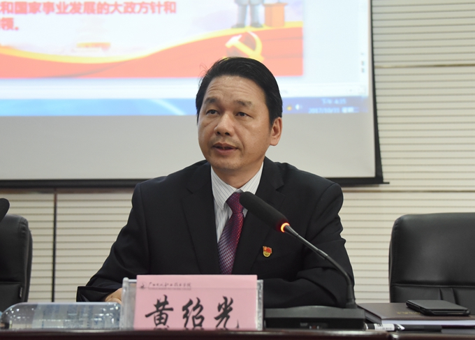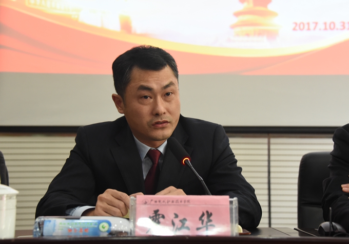 为贯彻落实中央、自治区党委的部署要求,10月31日下午,我院在第二学术报告厅召开传达学习党的十九大精神大会。学院党委书记韦伟松、院长黄绍光,党委副书记、副院长霍江华,副院长韦胜东、纪委书记冉景峰、副院长冯忠伟出席会议。全体教师党员参加会议。会议由学院党委副书记、副院长霍江华主持。