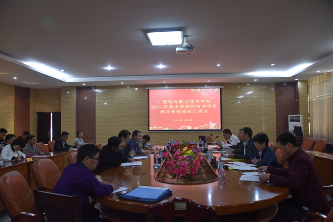11月1日下午,自治区水库移民局教育培训处处长覃革、河池市水库移民工作管理局副局长杨冬等一行5人组成的专家组,到我院考核验收水库移民培训项目并在图书馆会议室召开学院2017年度水库移民培训项目绩效考核验收汇报会。学院院长黄绍光,学院党委副书记霍江华,副院长韦胜东、冯忠伟出席汇报会。培训部全体成员及财务处、电子电力工程系、机电工程系等相关负责人参加汇报会。汇报会由霍江华主持。
