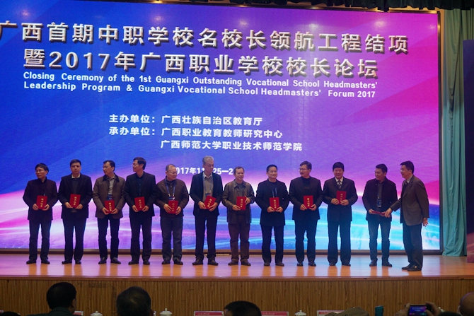 据悉,作为“区培”重点项目工程,广西首期中等职业学校名校长领航工程于2014年9月启动,由自治区广西教育厅牵头广西师范大学负责组织实施;目的是要打造一支新时期职业教育的领军队伍,打造一批特色鲜明的品牌学校,引领广西职业教育的改革探索,在新的起点上夺取更大的胜利。领航工程学员在全区330多所职业学校中遴选。我院韦伟松书记经选拔推荐、笔试、面试等严格程序入选。该班被誉为广西职业教育“黄埔一期”。经三年严格、系统学习和训练,该工程如期完成培训任务。