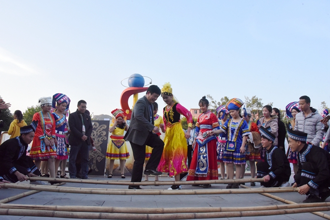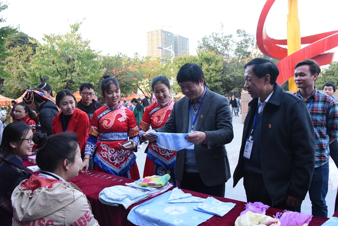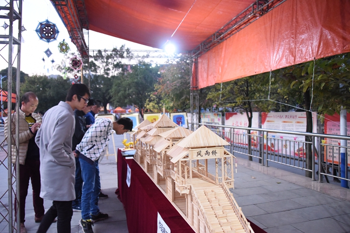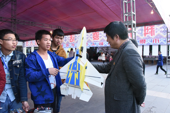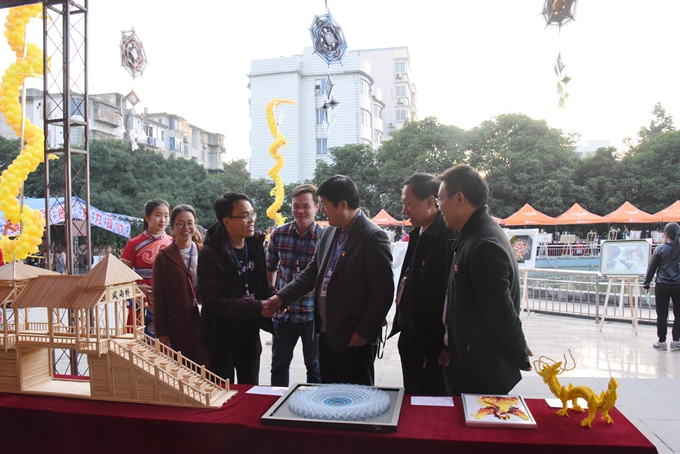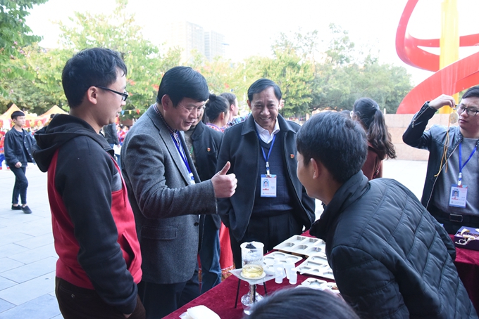 开幕式结束后,学院党委书记韦伟松、院长黄绍光、副院长韦胜东、纪委书记冉景峰到各系、各社团展区参观指导。在民族传统文化展区,韦伟松书记与同学们跳竹竿舞、滚铁环,体验民族文化的魅力。在各个展区,韦伟松书记与指导教师、制作参展作品的学生亲切交谈,鼓励大家创作出更多精品,力争把我院校园文化推向社会。