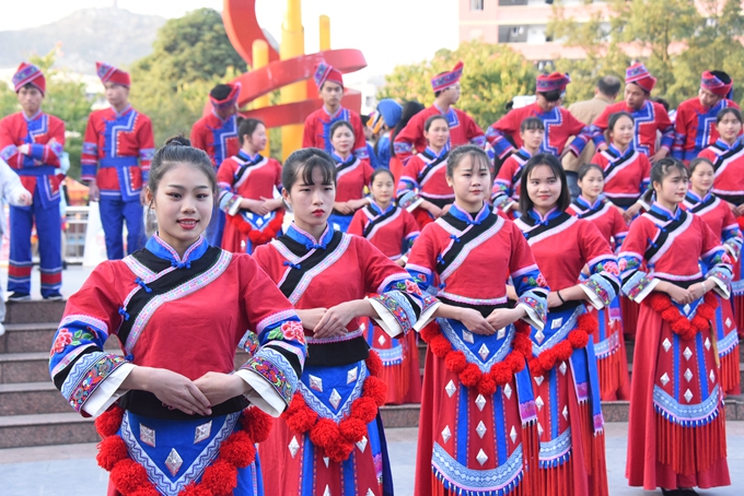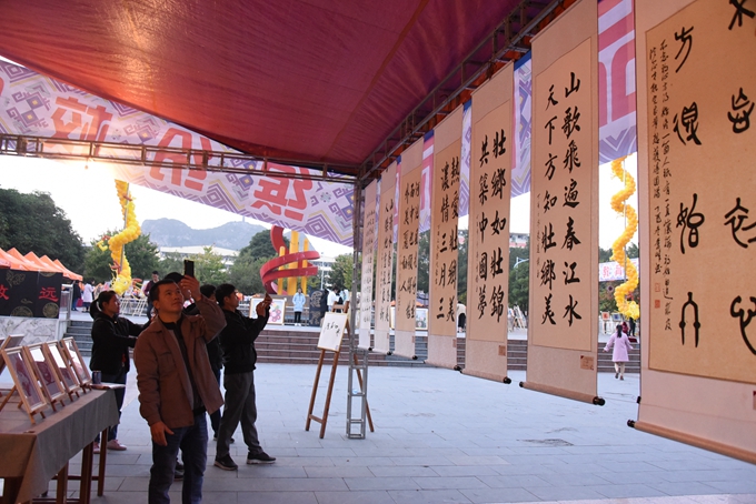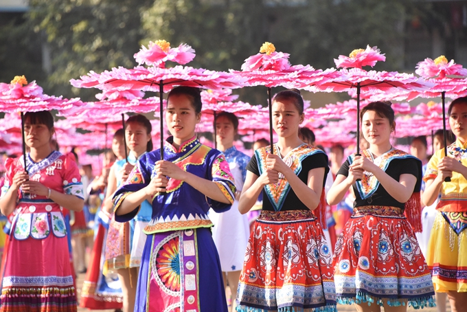 在开幕式上,大型花伞摆字表演呈现出“壮乡美”几个大字,龙狮队和各社团为现场观众带来精彩纷呈的表演;师生们身着民族服饰展示才艺,为文化艺术节添彩;各系学生也展示自制的旋翼无人机、民族手工作品和电子类作品等。