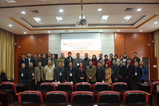 12月27日下午,自治区党委讲师团特聘教授专家,广西大学行健文理学院副院长陈洪涛教授到我院宣讲党的十九大精神,近300名师生在学院第二学术报告厅聆听报告。院长黄绍光、副院长韦胜东、纪委书记冉景峰、工会主席覃志航出席。院长黄绍光主持报告会。