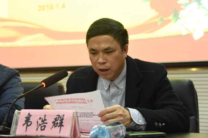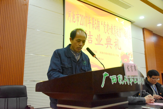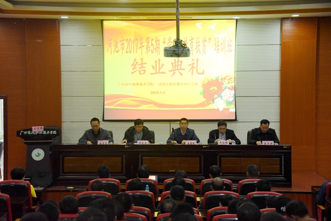 1月4日下午,河池市“党建+教育扶贫”就业技能培训第五期培训班结业典礼在我院第二学术报告厅举行。学院纪委书记冉景峰,市职业教育中心学校培训处主任韦浩群,学院后勤管理处处长侯干才,河池市委组织部基层办副主任胡万志出席结业典礼,第5期“党建+教育扶贫”培训班全体学员,参与本期培训班管理的相关部门人员和培训班的指导教师、班主任参加结业典礼。结业典礼由学院培训部主任罗之尚主持。
