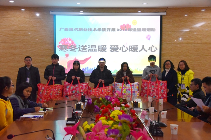 为切实解决同学们冬天保暖问题,保障学生的学习生活,1月12日早上,我院在图书馆会议室开展了“初冬送温暖 爱心暖人心”活动。学院纪委书记冉景峰、学生工作处处长李铃出席活动。活动由学工处副处长刘丽红主持。