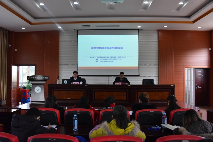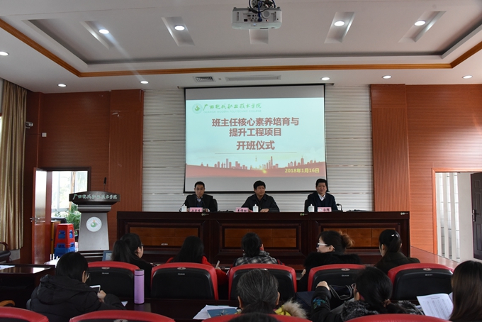 1月16日下午,我院班主任核心素养培育与提升工程项目开班仪式在第二学术报告厅举行。学院党委书记韦伟松,广西师范学院马克思主义学院院长、广西师范学院全国高校辅导员发展研究中心副主任曾令辉出席开班仪式。全体班主任及专任(兼职)教师参加本次开班仪式。开班仪式由学院纪委书记冉景峰主持。