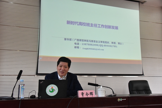开班仪式结束后,曾令辉教授为培训学员作题为《新时代高校班主任工作创新发展》的专题报告。他从新时代班主任工作创新发展的时代背景、依据、现实基础、拟突破的关键点、发展思路及班主任工作者的使命担当几个方面,用先进的理念、生动的案例和精彩的讲解,深入解读班主任的内涵和工作职责,强调只有优秀的班主任,才能培养出优秀的学生。报告让全体班主任受益匪浅。
