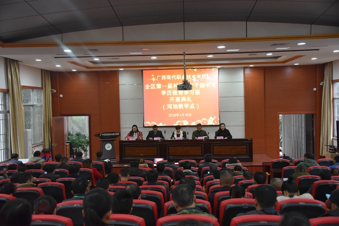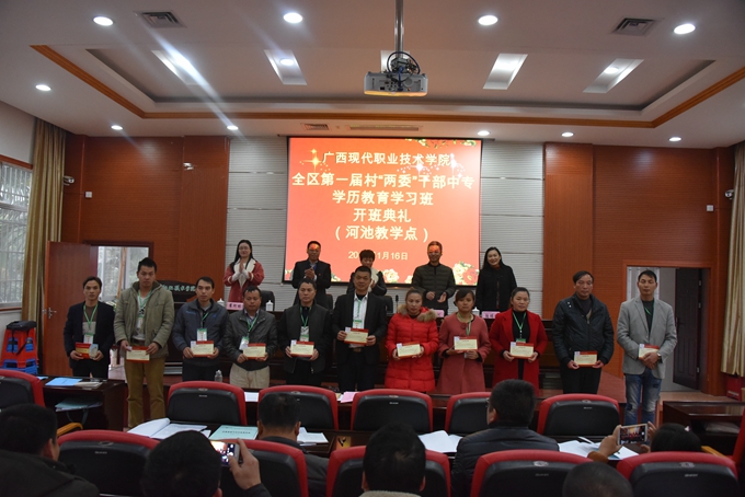 在广西广播电视大学、河池市委组织部和广西现代职业技术学院的精心策划和组织下,1月15日至20日,全区第一届优秀村“两委”干部中专学历函授教育(河池电大教学点)培训班在我院举办。来自河池市120余名村“两委”成员参加了培训。