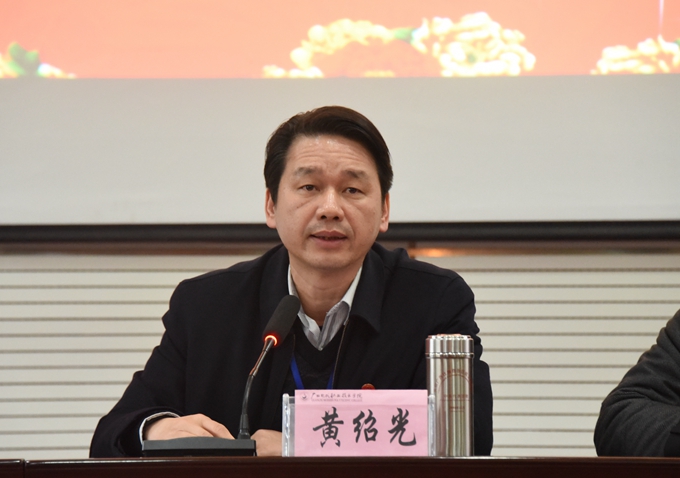 在当天下午召开的2017年秋季学期期末总结会上,院长黄绍光对2017年工作进行总结,部署安排2018年主要工作。黄绍光指出,2017年,学院领导班子一心一意谋发展,全体教职工开拓创新促成效,学院各项工作稳定协调发展,全年工作呈现十大亮点:全体教职工思想高度统一、状态大幅提升;质量持续提高,竞赛有新突破;新生报到创新纪录,规模历史最大;出口畅通,就业再获殊荣;引企入校,校企深度融合;加大投入,基础设施更完善;致力扶贫,社会培训有新招数;全员育人,全面启动德育品牌;校园活跃,民族活动得传承;做好服务,师生满意度提升。黄绍光强调,2018年是贯彻党的十九大精神的开局之年,是改革开放40周年,是广西壮族自治区成立60周年,也是学院成立40周年,全体教职工要持续发力,把思想变成信仰,把意志变成力量,把理论变成行动,把责任变成忠诚,把知识变成能力,要坚持立德树人底线,明确发展任务;深化教育教学改革,强化发展内涵;抓紧抓好学生管理,确保发展质量;加强校园基础建设,巩固发展基础;提升科研创新能力,展示发展水平。要切实抓好内部质量诊改工作,强力推进三全育人工作,加强校园文化建设,构造学校文化品牌,着力提高政治素养和业务能力,增强共事意识,促进学院各项工作实现新发展。