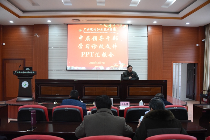 又讯 根据学院中层领导干部学习“诊改”文件会议要求,2月7日,我院在学院第二学术报告厅举行中层领导干部学习“诊改”文件PPT汇报会。副院长韦胜东、纪委书记冉景峰、副院长冯忠伟出席会议。学院全体中层领导干部参加会议。会议由副院长韦胜东主持。