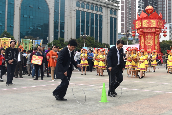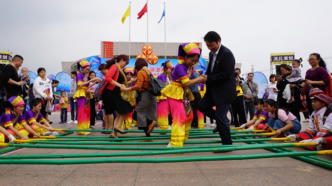 竹竿舞、板鞋、滚铁环、跳绳、扁担舞、打陀螺、背篓抛绣球、高杆抛绣球,这些带着浓浓乡情的竞技活动展示了民族体育的魅力和乐趣。在活动现场,两校领导和市民们参与热情高涨,互动体验的乐在其中,驻足观看的开怀大笑,这场以两校师生和广大市民为主角的精彩民族体育赛事,乐趣十足。