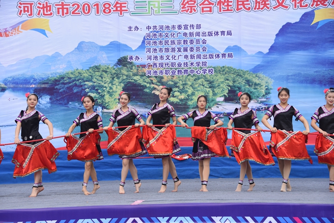 2018年4月12日,由中共河池市委宣传部、河池市民族事务委员会、河池市文广新体局、河池市旅游发展委员会主办,我院和市职业教育中心学校共同承办的“壮美河池•多彩职教——壮族三月三•河池嘉年华”活动在河池市体育广场举行。中共河池市委宣传部副部长李卫珍,学院党委书记、市职业教育中心学校校长韦伟松,院长黄绍光,市职业教育中心学校党委书记黄丹峻、市文广新体局副局长刘良钦、市民族宗教委员会副主任银磊等领导出席。在活动现场,两校通过少数民族文化综合展演,向观众展示了河池少数民族的文化魅力,赢得了广大市民的由衷点赞。