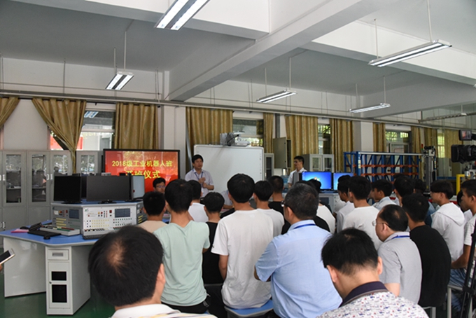 学院党委书记、市职业教育中心学校校长韦伟松在开班仪式上讲话。韦伟松指出,随着中国智能工业的升级调整,机器人在智能制造中的作用越来越突出,市场对此类人才的需求非常巨大,产业发展前景广阔。我院和市职业教育中心学校在提升工业机器人技术专业人才培养的基础上,努力在学生中培养后备力量,选拔出有兴趣爱好、基础较好的29名学生组建了首届工业机器人技术精英班,这是积极响应国家智能制造的发展要求,也是学院实现快速稳健发展的需要。韦伟松强调,这个时代造就大国工匠,新时代更需要大国工匠。精英班全体学生要有目标、有高度,要自信、要认真,要坚持、要出彩;要认真对待自己的选择,利用好这个平台,认真学习相关专业知识,为以后的工作打下坚实基础。韦伟松希望,两校机器人团队教师不仅要注重对学生的培养,还要全方位、多维度创新专业课程体系,将教学工作与企业需求无缝对接,努力培养高素质专业化的精英人才。
