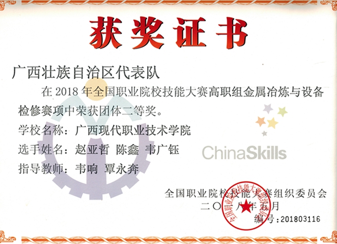作为2018年全国职业院校技能大赛的收官之作,6月22日,高职组“金属冶炼与设备检修”赛项在天津工业职业学院鸣锣开赛,这也是该赛项首次进入国赛。以我院资源系党总支书记韦文业为领队,资源系副主任韦响、专业教师覃永奔、廖琼章指导的学生赵亚哲、陈鑫、韦广钰,在异常激烈的角逐中,一路过关斩将,最终荣获高职组“金属冶炼与设备检修”团体二等奖!