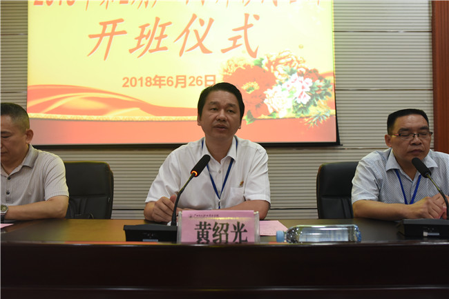 黄绍光院长在开班仪式上致辞,他向学员们详细介绍了河池市和学院的基本情况。他希望参加培训的学员们要珍惜学习机会,严格要求自己,集中精力听课,提高学习效果,真正能学有所获,并将所学知识转化为求生存、谋发展的实用技能,通过劳动增加收入,为加快生产、发家致富打下良好基础。同时他强调学员们一定要遵守校纪,注意形象,注意安全。
