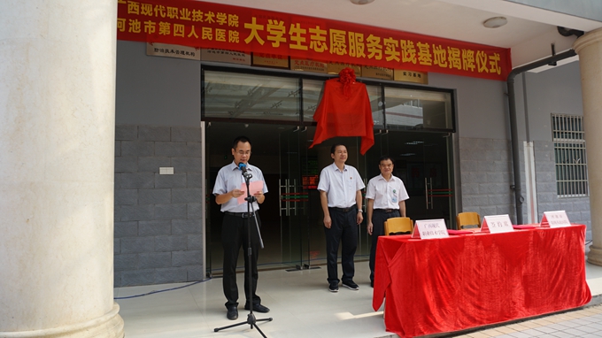 揭牌仪式上,学院院长黄绍光表示,近年来,为了提高我院教育教学水平和人才培养质量,我院强力推行“三全育人”工作。此次我院与河池市第四人民医院共建大学生志愿服务实践基地就是落实“三全育人”的重要举措。实践基地也将成为我院大学生展示才华、服务社会的重要舞台,成为大学生认识社会、贴近生活的重要窗口。同时成为充分发挥志愿服务的实践育人和文化育人功能,增强学生的社会责任感、创新精神和实践能力的重要平台。