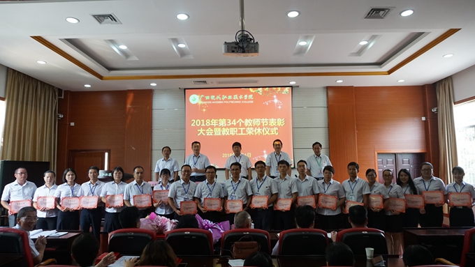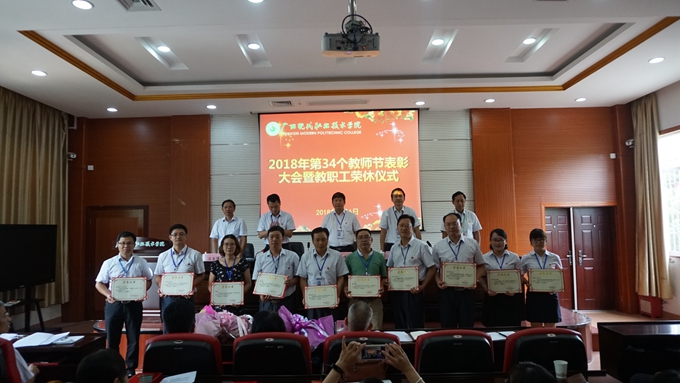 第34个教师节即将到来之际,我院于9月6日下午在第二报告厅召开2018年教师节表彰大会暨教职工荣休仪式,对过去一年先进集体、优秀教师、优秀教育工作者、优秀班主任、学生技能竞赛优秀指导教师、培训工作先进个人、项目建设突出贡献奖和教学标兵等进行表彰授奖,为光荣退休的教职工送上祝福。学院党委书记韦伟松、院长黄绍光,党委副书记、副院长霍江华,副院长韦胜东、副院长冯忠伟出席会议。全体教职工参加会议。会议由学院党委副书记、副院长霍江华主持。