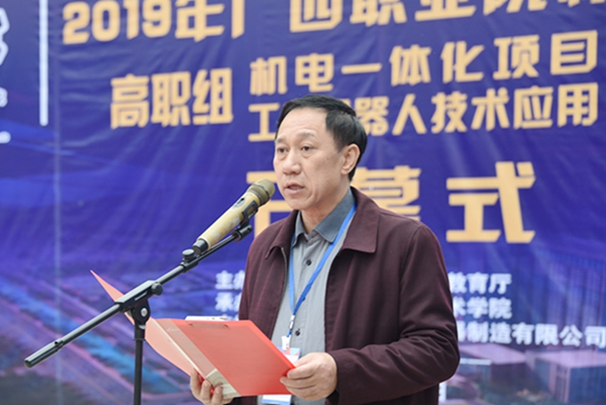 3月27日下午,由自治区教育厅主办、我院承办的2019年广西职业院校技能大赛高职组“工业机器人技术应用”、“机电一体化项目”赛项启动仪式在田径场举行。学院党委书记韦伟松、院长黄绍光,党委副书记、副院长霍江华出席仪式。来自全区各职业院校参赛师生以及学院全体师生参加仪式。仪式由副院长韦胜东主持。 院长黄绍光在启动仪式上致辞。黄绍光指出,举办职业院校技能大赛,是对职业教育发展成果的大检阅,是对职业院校广大师生奋发向上、锐意进取精神风貌的大展示,对于进一步宣传职业教育、营造良好社会发展氛围,推动职业教育又好又快发展具有十分重要的意义。黄绍光表示,此次技能大赛必将成为各兄弟院校相互交流的良好平台,成为兄弟院校加快发展、科学发展的助推器。学院一定当好东道主,为领导嘉宾和选手提供最优质的服务,办出高水平、高质量、安全有序、特色鲜明的大赛。 “机电一体化项目”赛项裁判长刘学军讲话,表示裁判员一定服从大赛指挥,严格遵守竞赛纪律和规则,营造公开、公平、公正的比赛氛围。“工业机器人技术应用”赛项裁判长郝卫东、参赛选手代表庞健海分别宣誓。 学院党委书记韦伟松宣布2019年广西职业院校技能大赛高职组“工业机器人技术应用”、“机电一体化项目”赛项开幕! 据悉,此次比赛旨在通过各职业院校学子交流经验、切磋技艺、展示水平,达到以赛促教、以赛促学的目的,进一步推动职业院校相关专业深化教育教学改革。