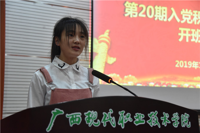开班典礼上,机电工程系17机器人班林仁财同学作为上一期优秀学员代表发言,谈了自己在党校学习的收获与体会并提出要把在党课学习中的所得所悟转变为实际行动,争取获得更大的进步。教育系18小教8班李金凤同学作为本期学员代表发言,表示要珍惜这次学习机会,全面深刻学习领会党的理论知识,用一个党员的标准严格要求自己,自觉接受党组织的教育、培养,牢记党的宗旨,做全心全意为人民服务的模范;她代表全体学员决心从现在做起,做好为同学服务,为学校服务,遵守校纪校规,努力为创建文明和谐的校风、学风贡献自己的力量。