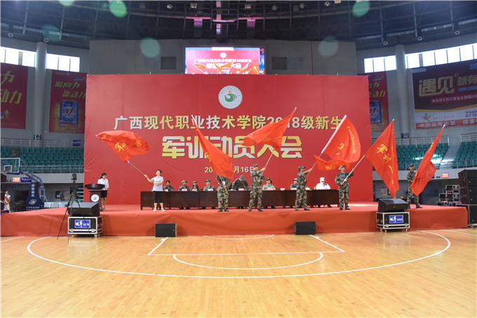 2018年9月16日上午9点,我院2018级新生军训动员大会在河池市体育馆隆重举行。学院院长黄绍光,党委副书记、副院长霍江华,副院长韦胜东、副院长冯忠伟,河池市金城江区人民武装部部长彭良辉、副部长李志良、军事参谋周扬杰,河池市公安消防支队司令部警训科副科长刘道文等出席大会。学工处、团委、教科处、宣传部、后勤处、保卫处等部门主要领导,各系主任、党总支书记及团总支书记,75名承训教官与近3700名2018级新生参加了动员大会。大会由学工处处长李铃主持。