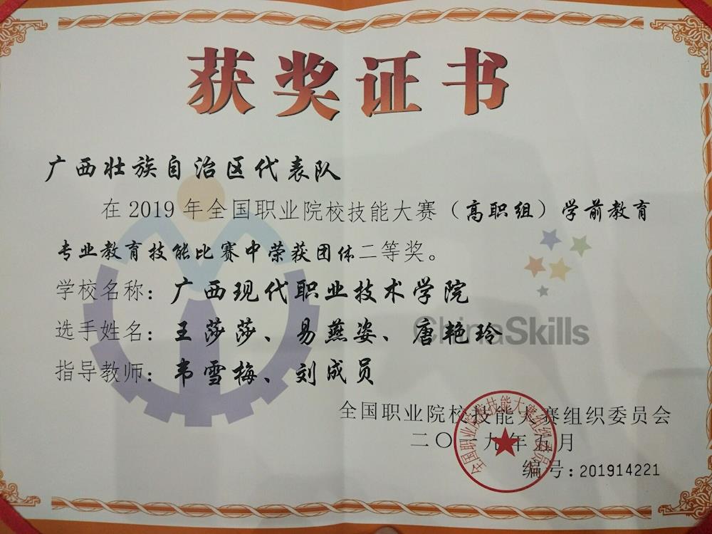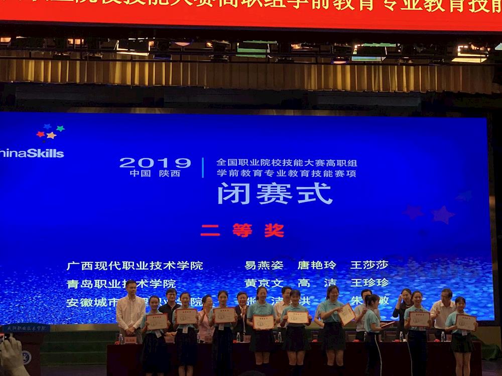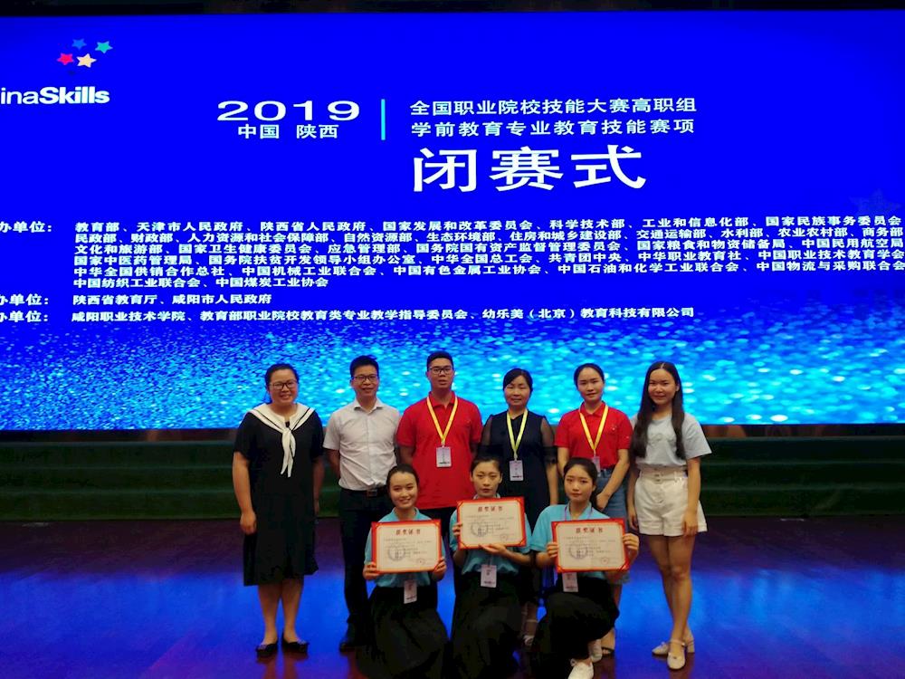 5月26日上午,2019年全国职业院校技能大赛高职组“学前教育专业教育技能”赛项在咸阳职业技术学院圆满落幕,经过激烈比拼,由我院韦雪梅、刘成员老师指导,王莎莎、易燕姿、唐艳玲三位同学组成的代表队凭借出色发挥,喜获大赛二等奖!