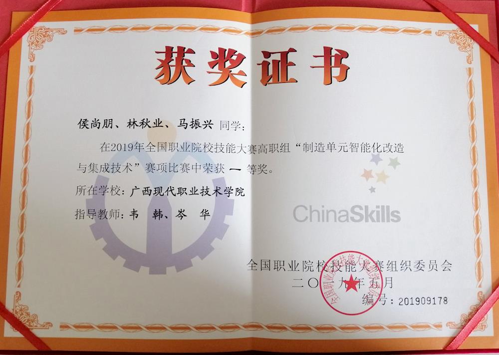 6月2日上午,我院学生技能大赛再传喜讯!在刚刚闭幕的全国职业院校技能大赛高职组“制造单元智能化改造与集成技术”赛项中,由我院机电工程系韦韩、岑华老师指导,侯尚朋、林秋业、马振兴3位同学组成的代表队,在来自全国各高校的多支参赛代表队中不畏强手,力压群雄,以绝对优势再次斩获国赛一等奖!此赛项夺冠,也让我院成为今年截至目前,广西职业院校在全国职业院校学生技能竞赛中获得一等奖最多的两所高校之一。