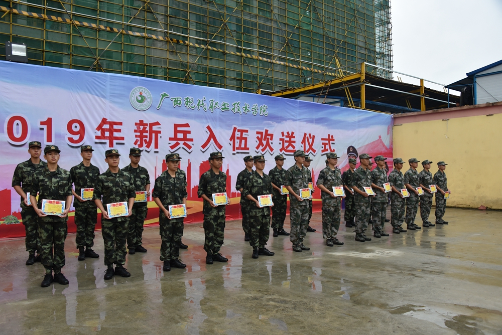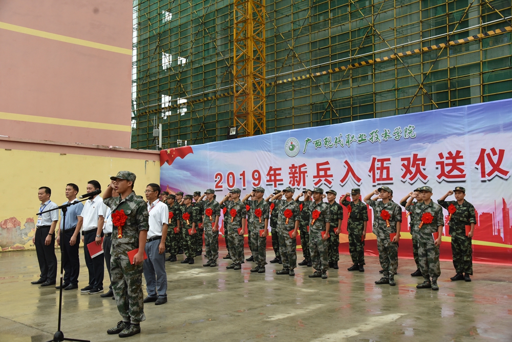9月9日上午,我院在田径运动场隆重举行2019年新兵入伍欢送仪式,欢送今年光荣应征入伍的26名新兵。学院院长黄绍光、副院长韦胜东、纪委书记张斌、副院长冯忠伟、院长助理覃孜出席欢送仪式,各系部领导、全体师生以及部分入伍学生家长参加仪式。仪式由学生工作处处长李铃主持。