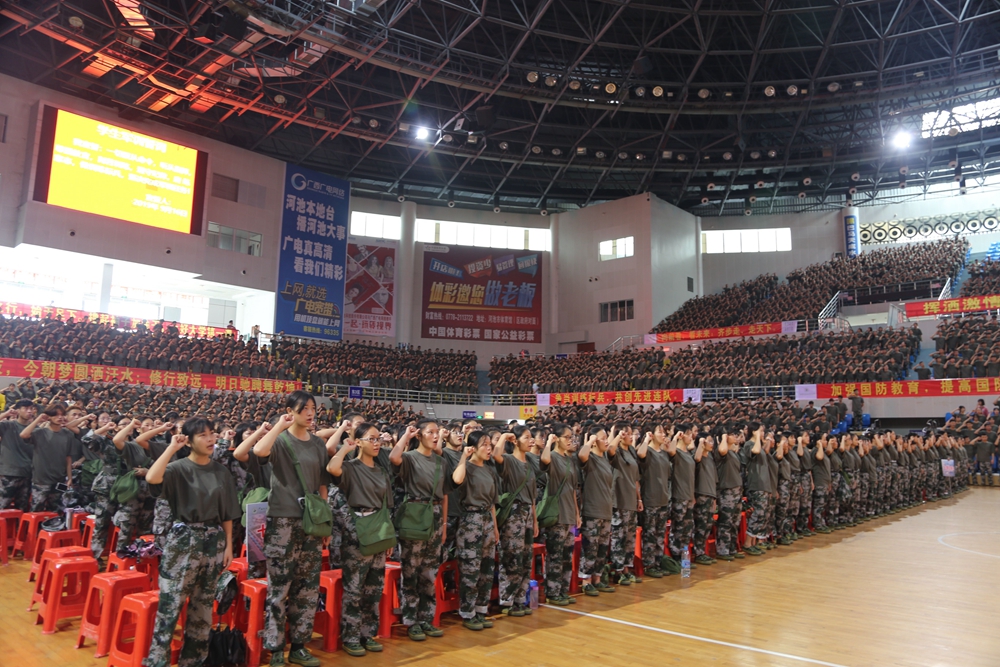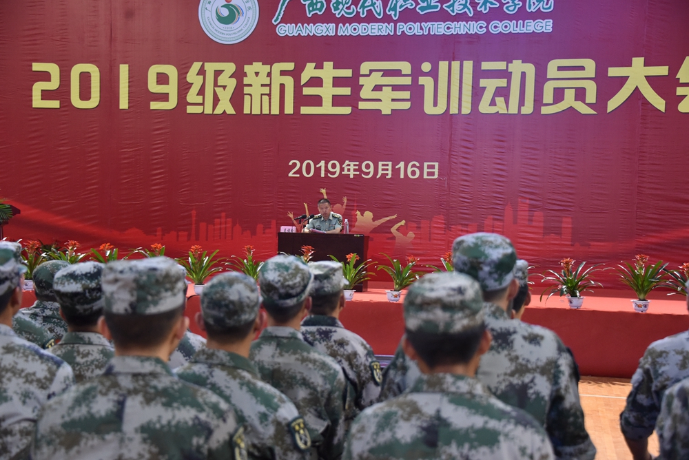 2019年9月16日上午,我院2019级新生军训动员大会在河池市体育馆隆重举行。学院纪委书记张斌、副院长冯忠伟,河池市金城江区人民武装部部长彭良辉,院长助理杨奎、覃孜,河池市消防救援支队防火处助理黄学杰等出席大会。学工处、团委、教科处、宣传部、后勤处、保卫处等部门主要领导,各系主任、党总支书记及团总支书记,75名承训教官与近4000多名2019级新生参加了动员大会。大会由学工处处长李铃主持。