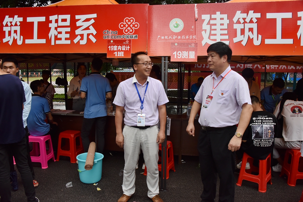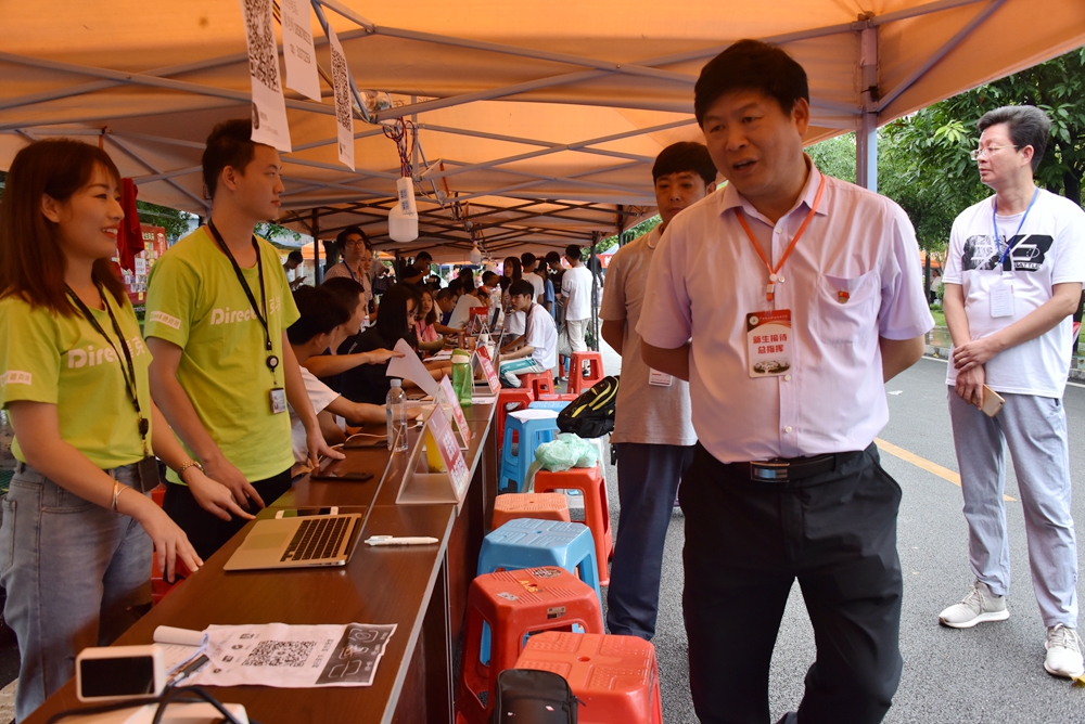 9月10日,学院党委书记韦伟松在院办、招生处、纪检办等相关部门负责人陪同下,对各迎新接待点坚守一线阵地的迎新工作人员进行慰问。