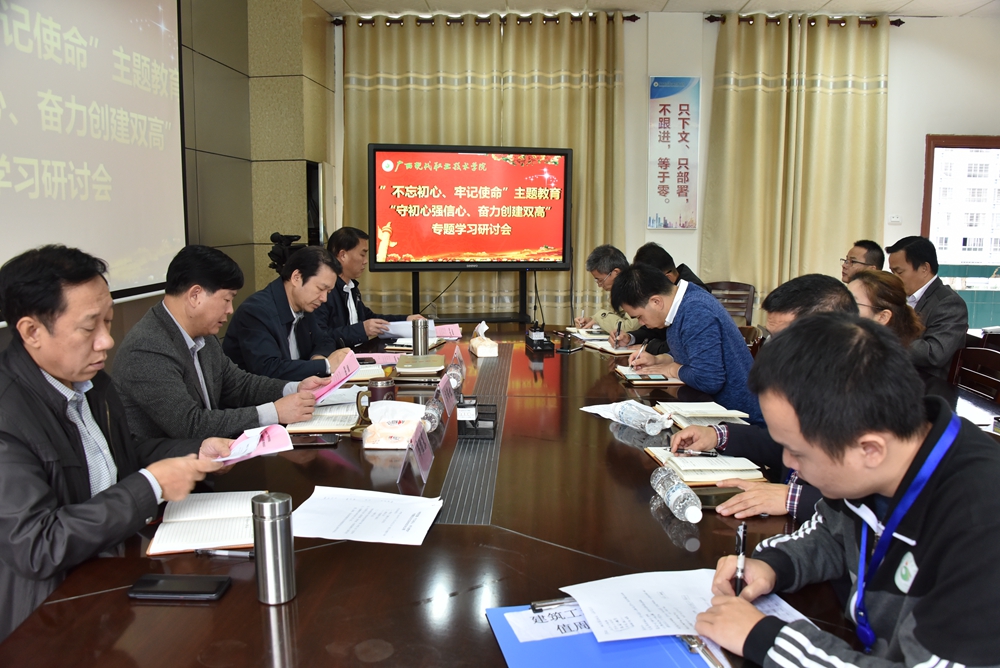 中共广西现代职业技术学院委员会“守初心强信心、奋力创建双高”专题学习研讨会在学院一号办公楼五楼会议室举行,会议围绕“守初心强信心、奋力创建双高”专题进行学习研讨。